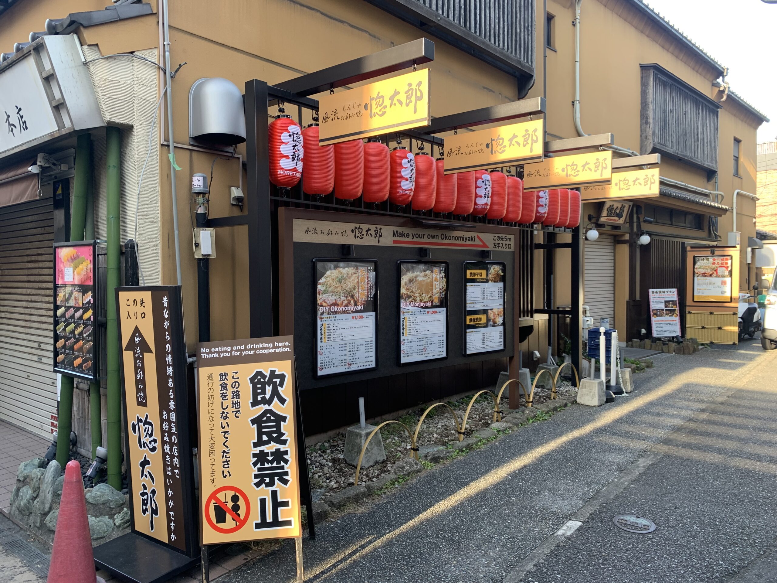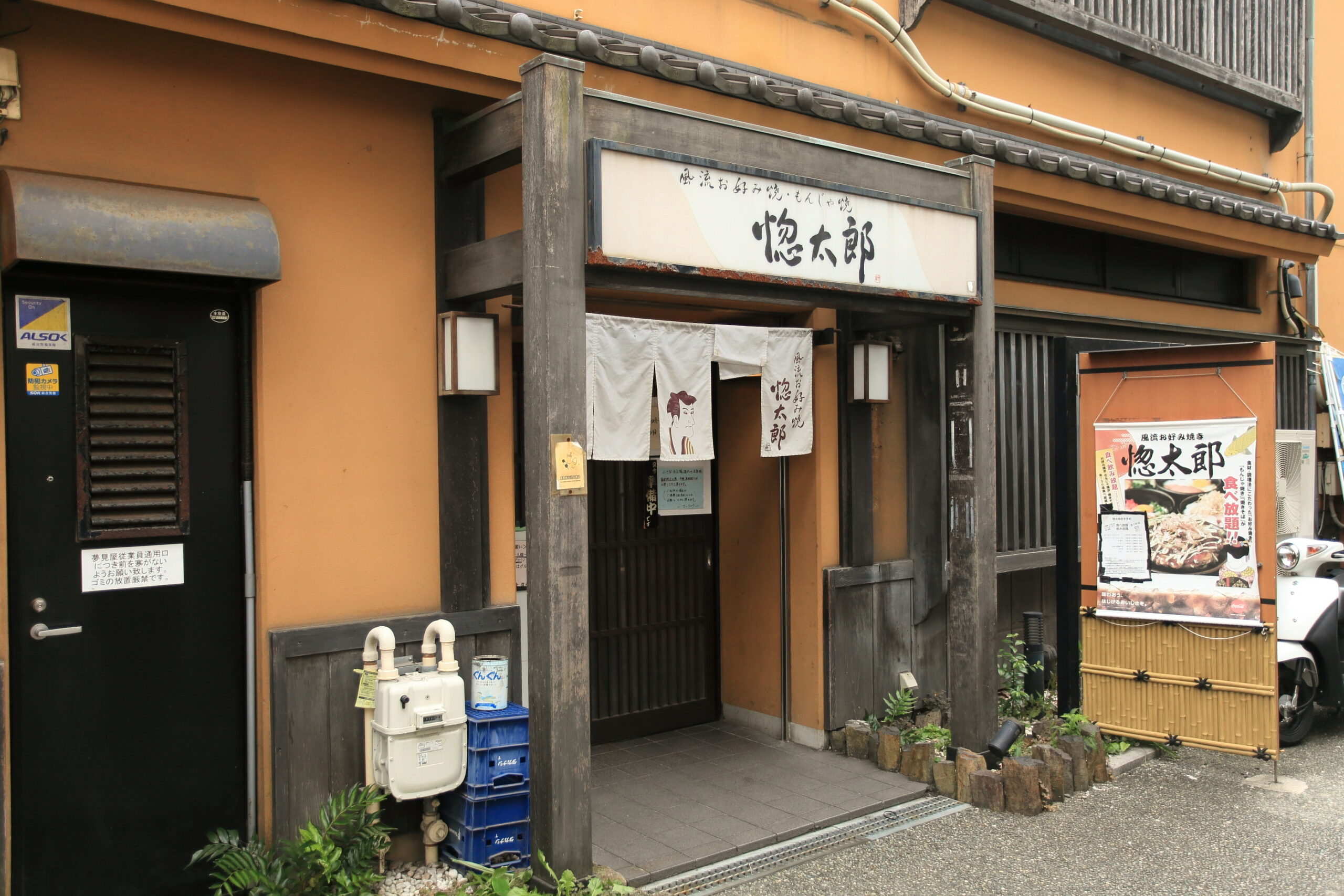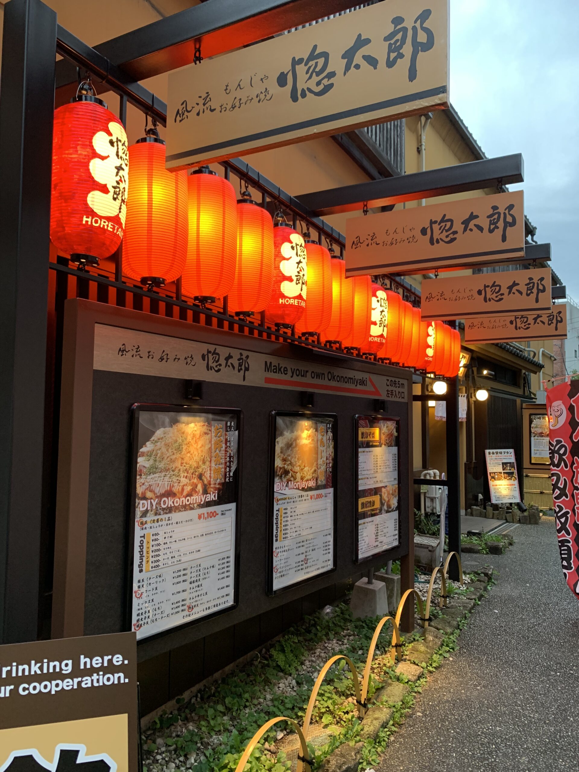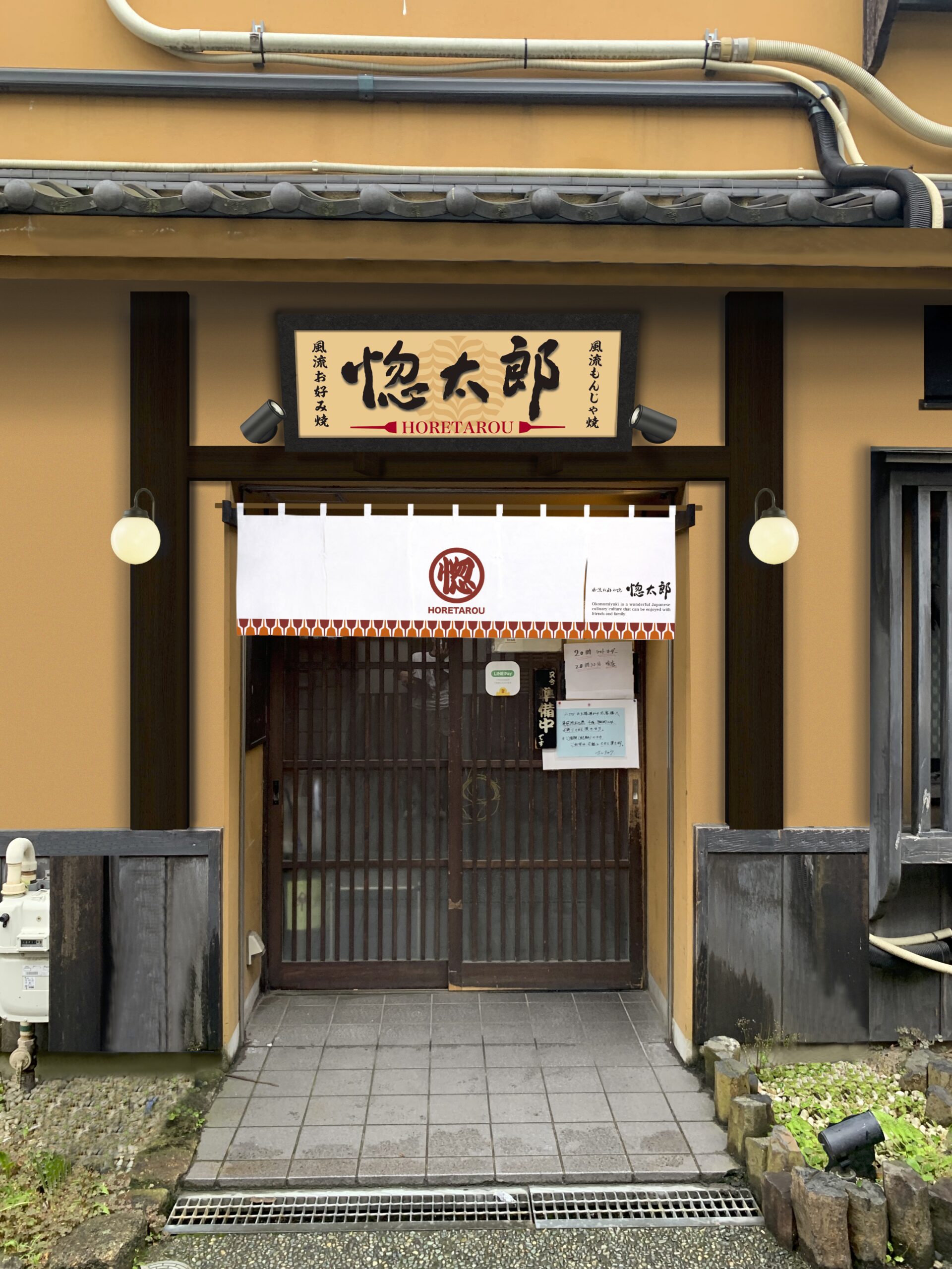 (改修工事前の写真) 20年ほど前にオープンしたお好み焼き店の屋外看板や外壁塗装が傷んできましたので、店頭デザインと改修工事をさせて頂きました。