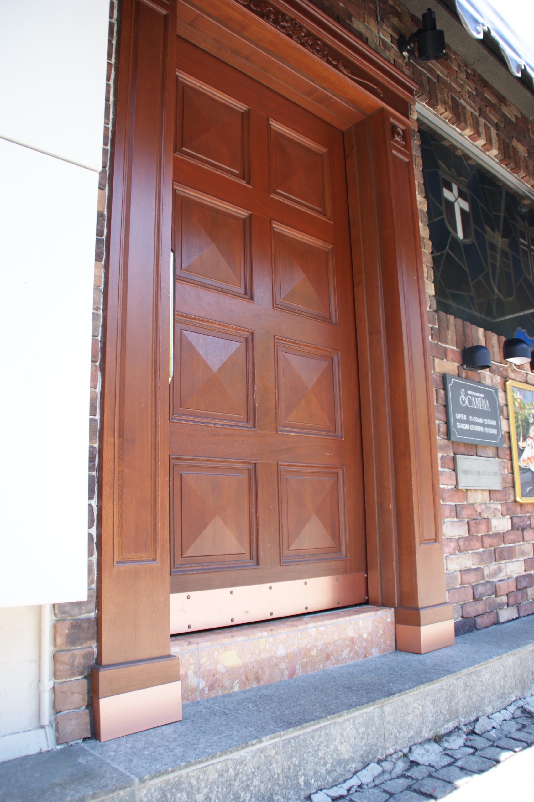 (改修工事後の写真) 扉と枠は、かなり腐食が進んでいた為、多くを取り替える必要がありましたが、半世紀以上もこのレストランの入口に構えていた扉…この重厚感は次の扉にも繋げたかったので、大きく扉のイメージは変えずに、利用できる物、再現出来そうな部分は造作にて再現し、入り口ゲートは扉の重厚感に合うような装飾を施しました。