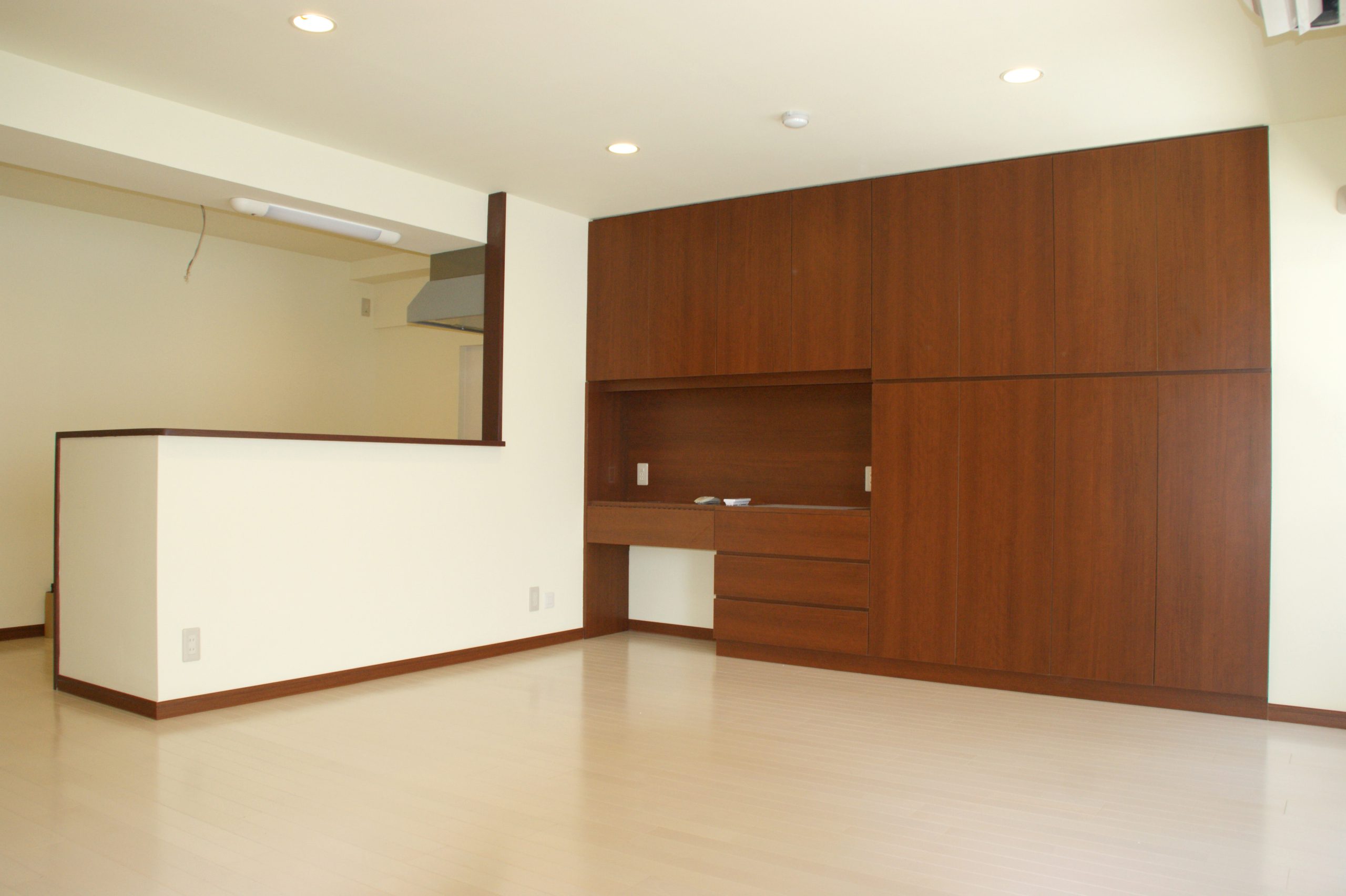 (改修工事後の写真) 細かく区分けされていた間取から、大きなリビングを設け、家族が集まる団欒エリアを日当たりの良い南側にレイアウトしました。このエリアには、躯体の柱型がコーナー部分にありましたが、この柱型を目立たせないように出幅に沿ってオーダー造作家具を納め、梁型もカーテンボックスに利用しつつ出っ張りを目立たせないようにしました。