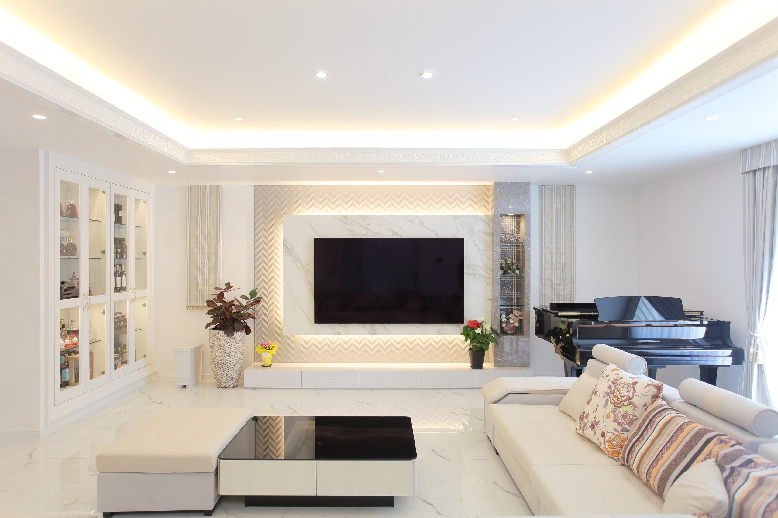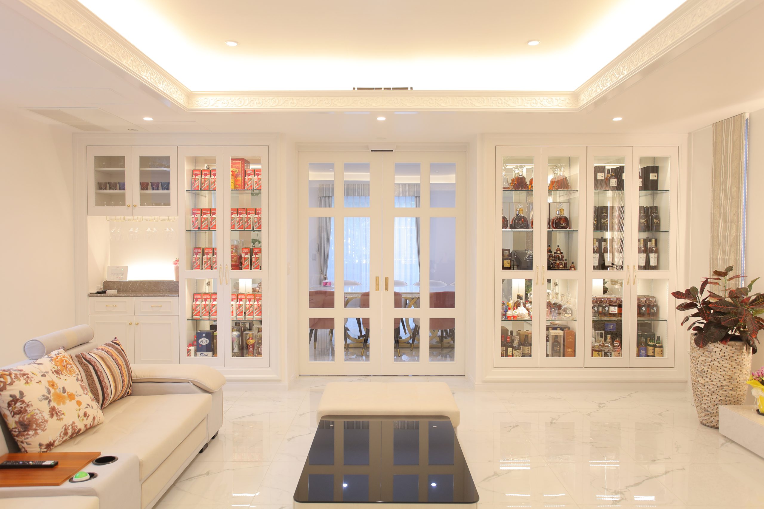 広いリビングが特徴の新築一戸建ての家具デザインのお仕事をさせて頂きました。 白を基調とした清潔感のあるリビングに75インチのテレビを設置する造り付けのテレビ台と、お酒を展示するディスプレイ家具を壁面に埋め込み、ダイニングに向かう扉と一体となる様にデザインしました。