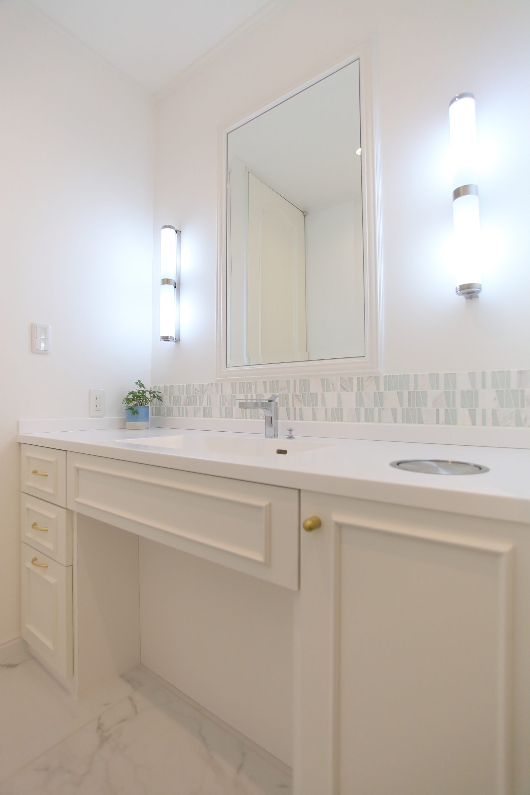 一回りコンパクトの洗面台もデザインさせて頂きました。立上り部分にはガラス入りのモザイクタイルを貼り、透明感のある雰囲気に仕上げております。