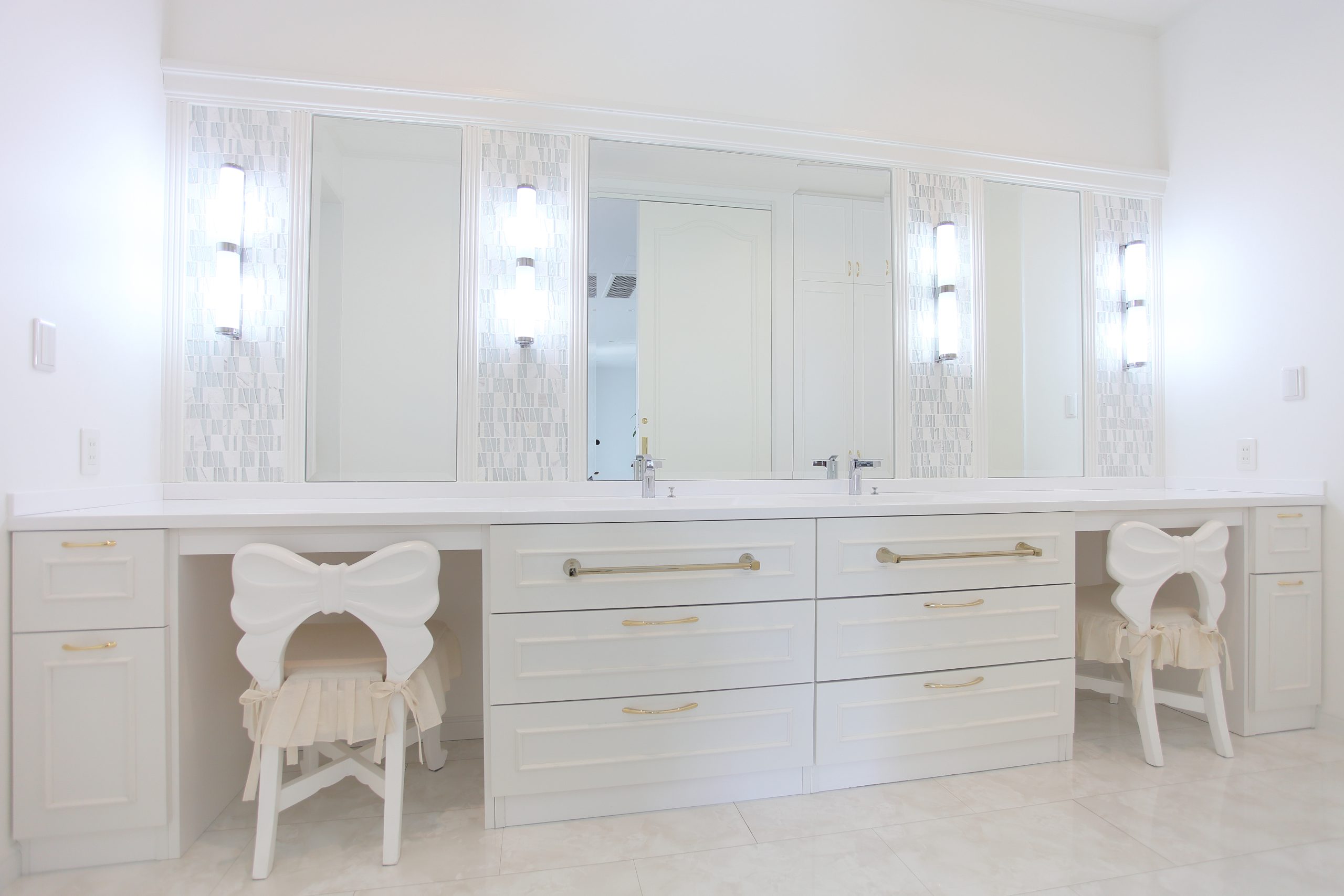 洗面台の家具デザインをさせて頂きました。3人が同時に使用できる程の幅の広い洗面台となります。ミラーの脇には、モザイクタイルをアクセントに貼り、清潔感のある雰囲気に仕上がっております。