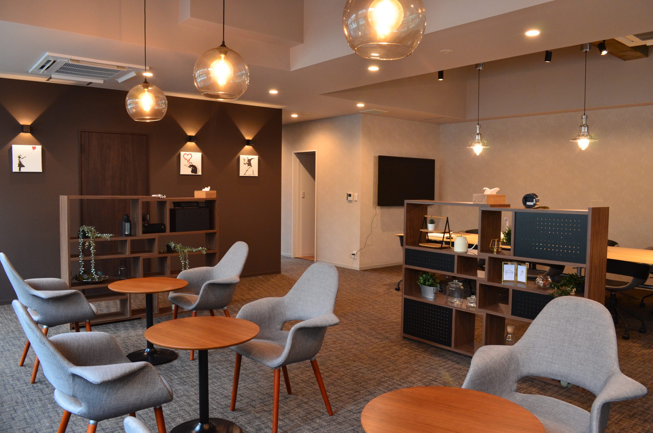 (改修工事後の写真) 社員さんの席は決まっておらず、その日その日に席を移動して利用できるような依頼があり、大きなカウンター型テーブルを設け、自由に移動できる様にしました。 また圧迫感の無いように家具でレイアウトを分けて、円卓にドリンクコーナーも設けて、カフェの様な雰囲気の中で仕事ができるスペースも作らせて頂きました。